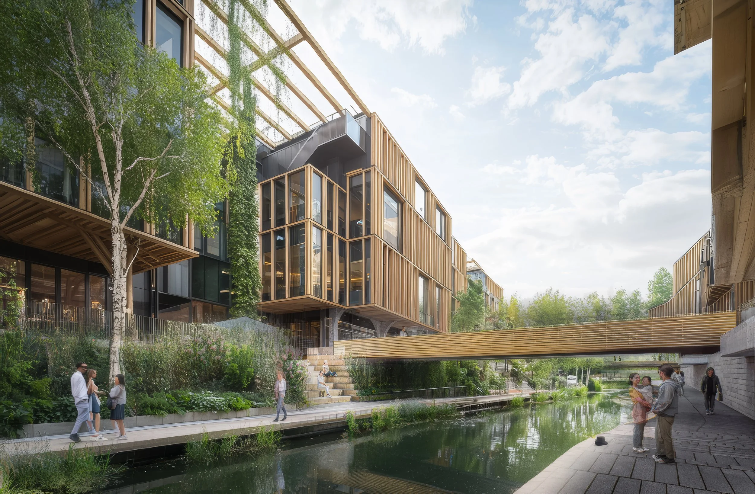 We recessed the ground floor to create a covered shopping arcade, providing shelter from the elements like sun and rain. Additionally, we graded the landscaped embankment all the way to the canal walk, adding greenery and biodiversity. This creates a more biophilic, garden-like environment lining the canal, enhancing the pedestrian experience.