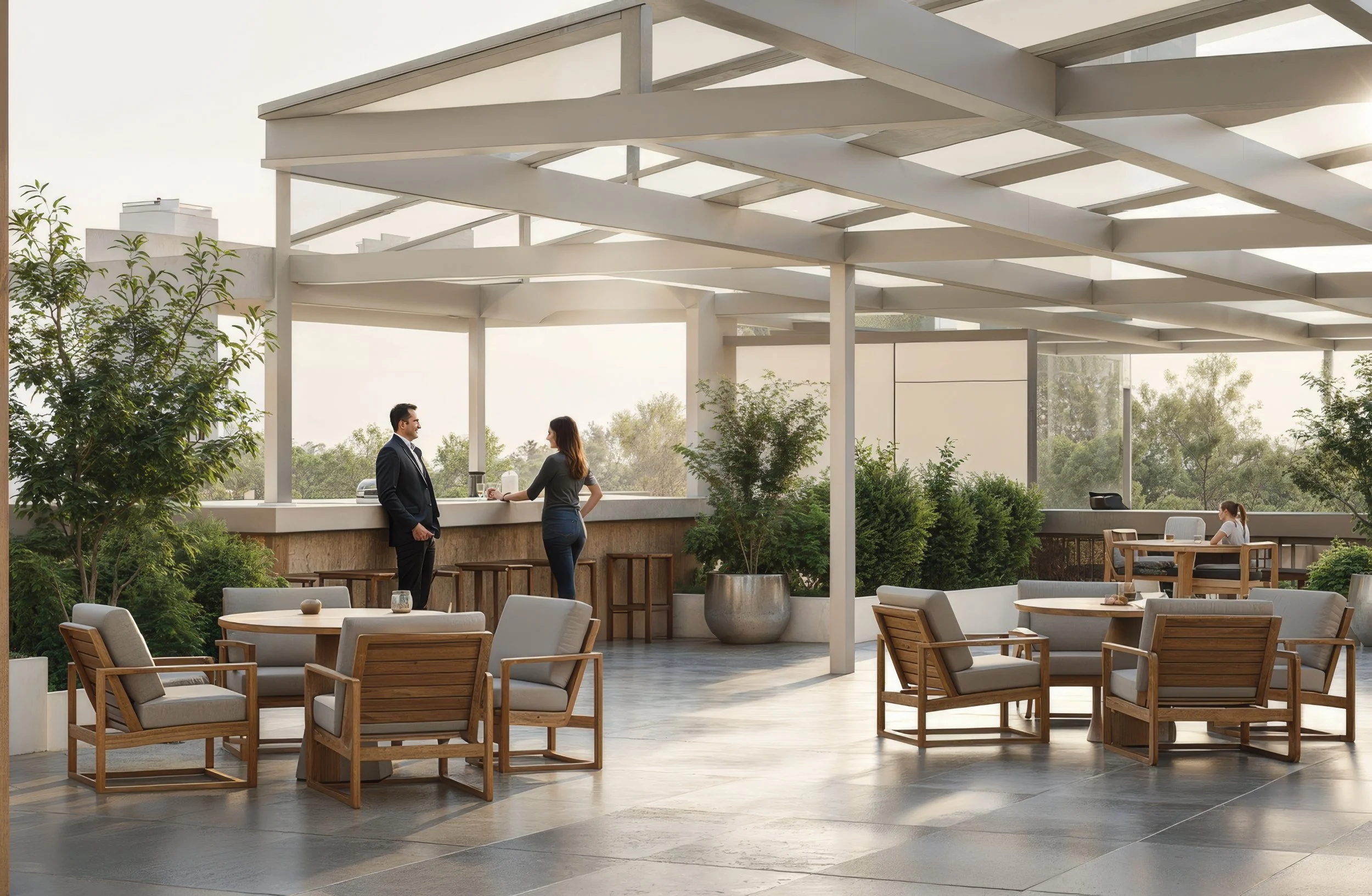 The rooftop is a sky oasis with urban agriculture planters and a photovoltaic canopy that generates renewable energy and provides shelter. This versatile space can be rented for events, generating extra revenue, and serves as a public amenity. Picture morning yoga, sunset drinks, and lunchtime BBQs, creating a vibrant community hub.